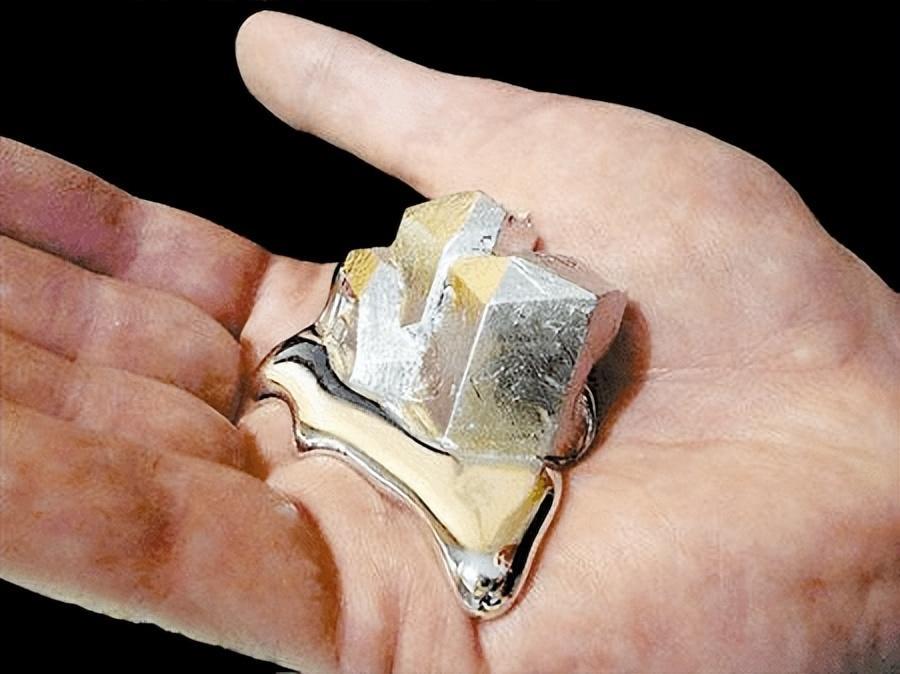 镓是一种神奇的物质,在室温下它是一种淡蓝色金属,它的沸点很高,当温度达到29.76℃时,会变为银白色液体,看起来很有光泽,像果冻一样。