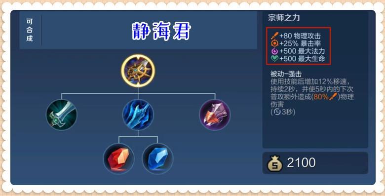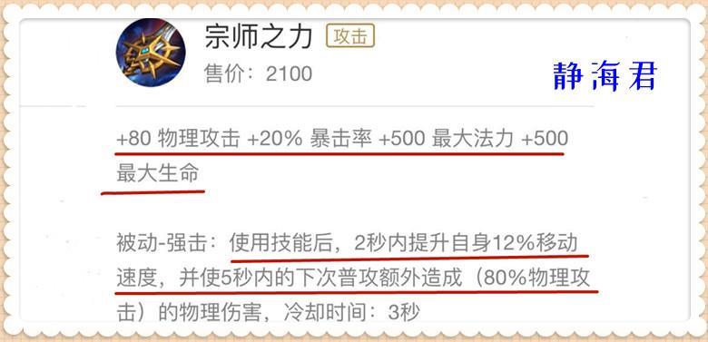 咱们凭良心讲,用2100g的价格就可以收获较高的物攻和暴击率加成,收获双400的生命值和法力值加成,收获较高的移速和额外伤害,这怎么看都是赚的。可即使是这样,策划依旧要加强宗师之力。