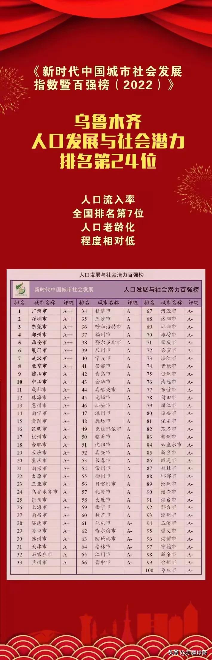 乌鲁木齐人口发展与社会潜力全国24位,人口流入率全国第7