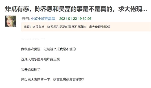 这个消息在很多年前就有流传了,当时陈乔恩就辟谣表示自己只是把吴磊当成弟弟一样看待。之后陈乔恩也直接怒怼谣言,称自己都能直接生了吴磊,形容两人年龄差距很大,根本就是不可能的事情。也有粉丝辟谣称,吴磊当时才十五岁,在剧组拍戏的时候一直都有妈妈跟着,怎么可能会做出这种事情。