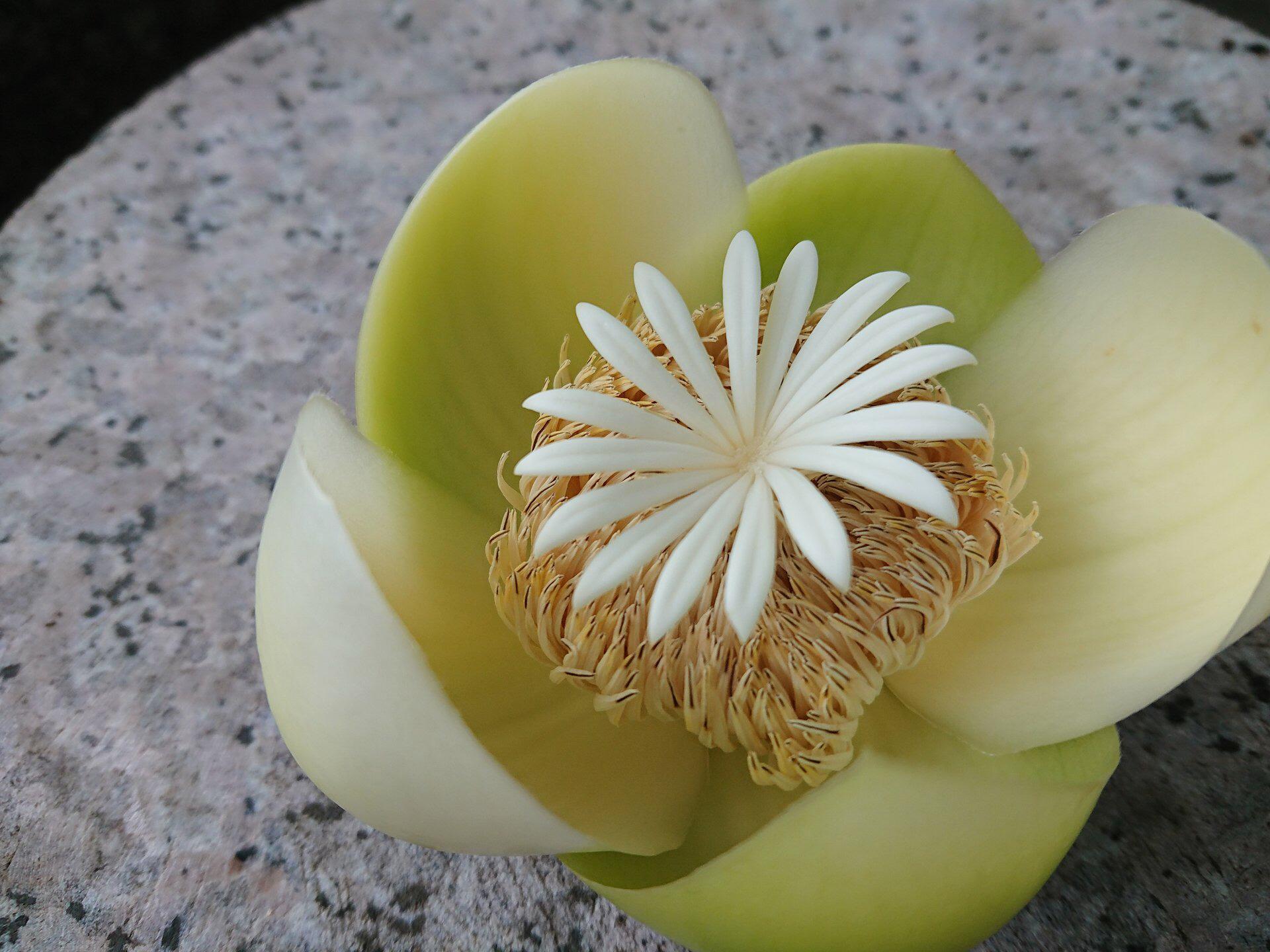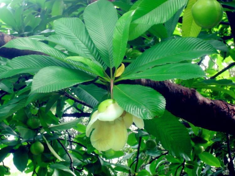 原形态五桠果 常绿乔木,高达30m。树皮红褐色,开裂成大块状薄片剥落;嫩枝被褐色柔毛,老枝无毛,有明显的叶痕。单叶互生;叶柄长5-7cm,有窄翅;叶片革质,长圆形或倒卵状长圆形,长15-40cm,宽7-14cm,先端短尖,基部宽楔形,边缘有锯齿,侧脉25-26对,干后两面均突起,初时两面有柔毛,不久脱落,仅在下面叶脉上有毛。花单生于枝顶叶腋内,直径12-20cm;花梗粗壮,被柔毛;萼片5,肥厚肉质,近圆形,长4-6cm,外侧被毛;花瓣白色,倒卵形,长7-9cm;雄蕊发育完全,外轮数目很多,内轮较少且比外轮长,花药长于花丝,顶孔开裂;心皮16-20,胚珠多数。果球形,直径9-15cm,不开裂;宿存萼片肥厚。种子扁,边缘有毛。花期4-5月。