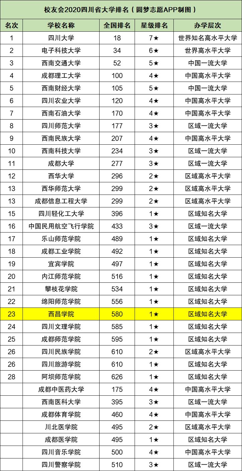 根据校友会2020年四川省大学排名(公办本科)可知,西昌学院在四川省内排在第23名,在全国高校中排在第580名,是一所区域知名大学。