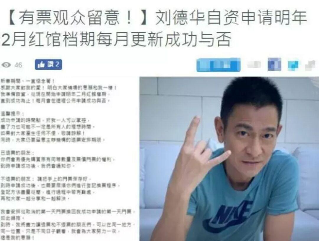2月16,刘德华粉丝官网公布了一条消息:“刘德华自费申请明年2月份红馆档期,每月更新消息,直到成功为止”,这条消息让无数粉丝振奋。