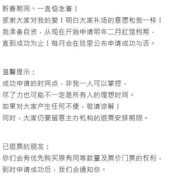 刘德华表示能否申请成功因素比较多,即使尽力了也不一定能满足所有人,在这条略显心酸的消息之后还有一条让歌迷雀跃的消息,已经退票的歌迷有优先购买同等价格同等数量门票的权利,当然,前提是能申请成功。