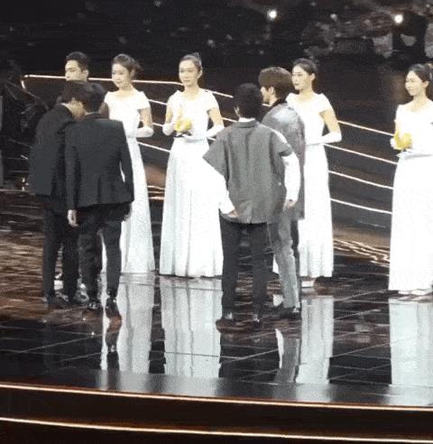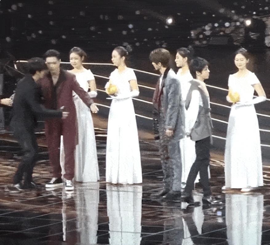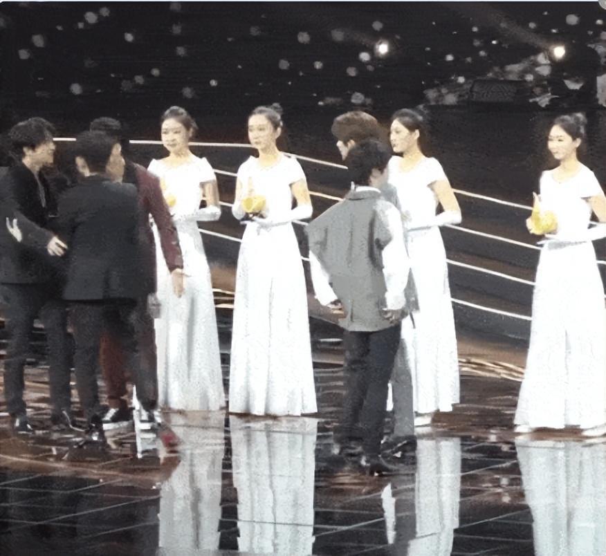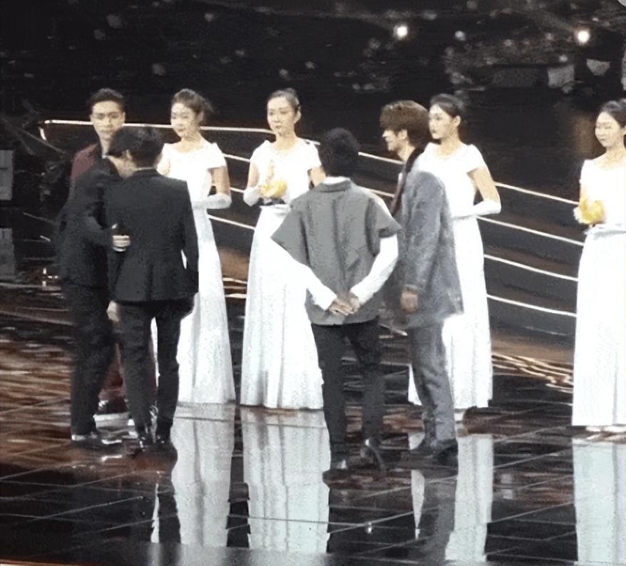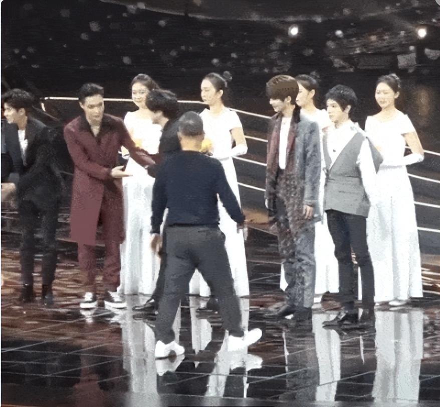 还有早就已经站在一旁的蔡徐坤,在两位戏精前辈“互让C位”很起劲的时候,他也一直在偷偷地迈着小碎步,偷偷地往C位的方向在走。