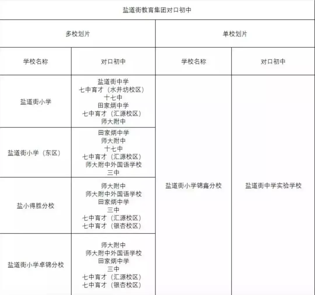 答:盐道街对口中学一般都是不会变的,看了一下今年的大概就是盐道街中学、七中育才水井坊校区、汇源校区、田家炳中学、十七中。师大附中,一般读田家炳的不多哈。
