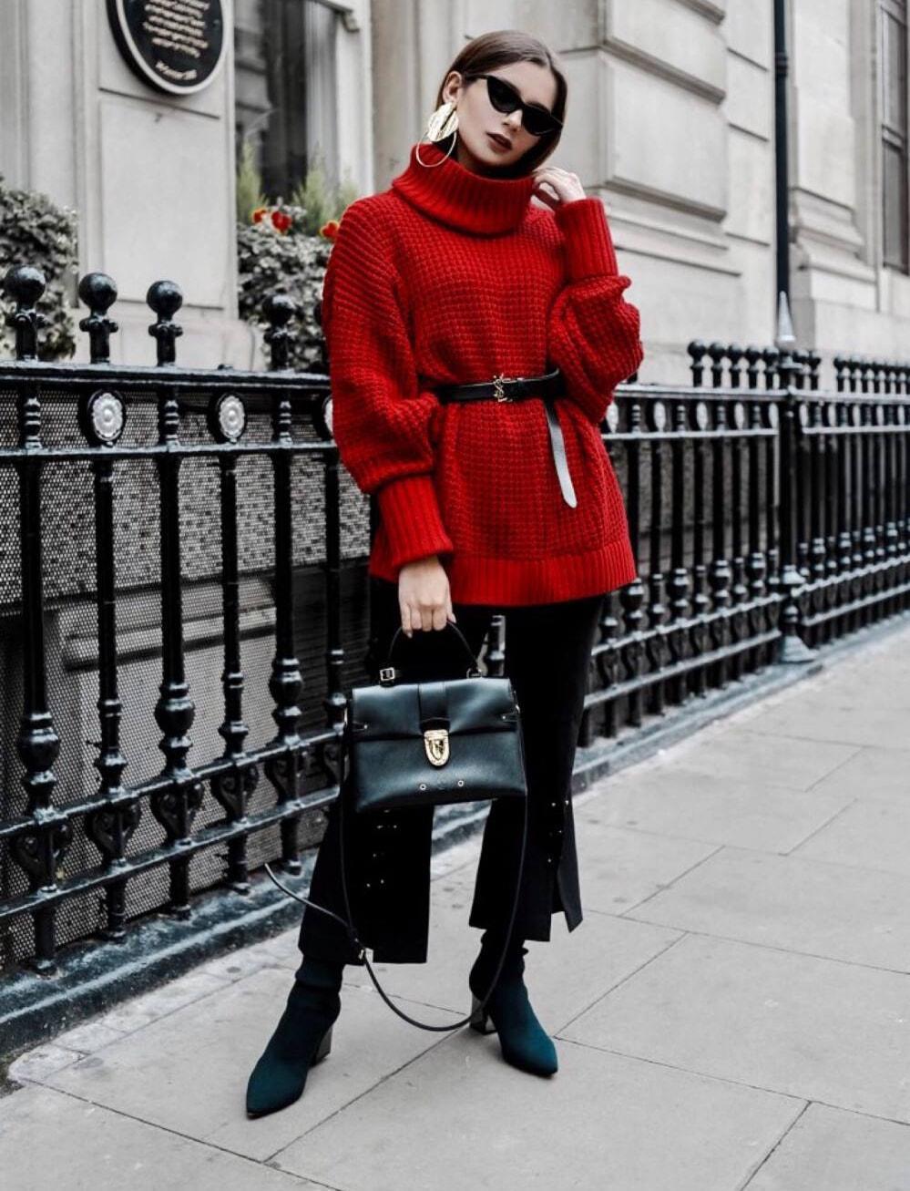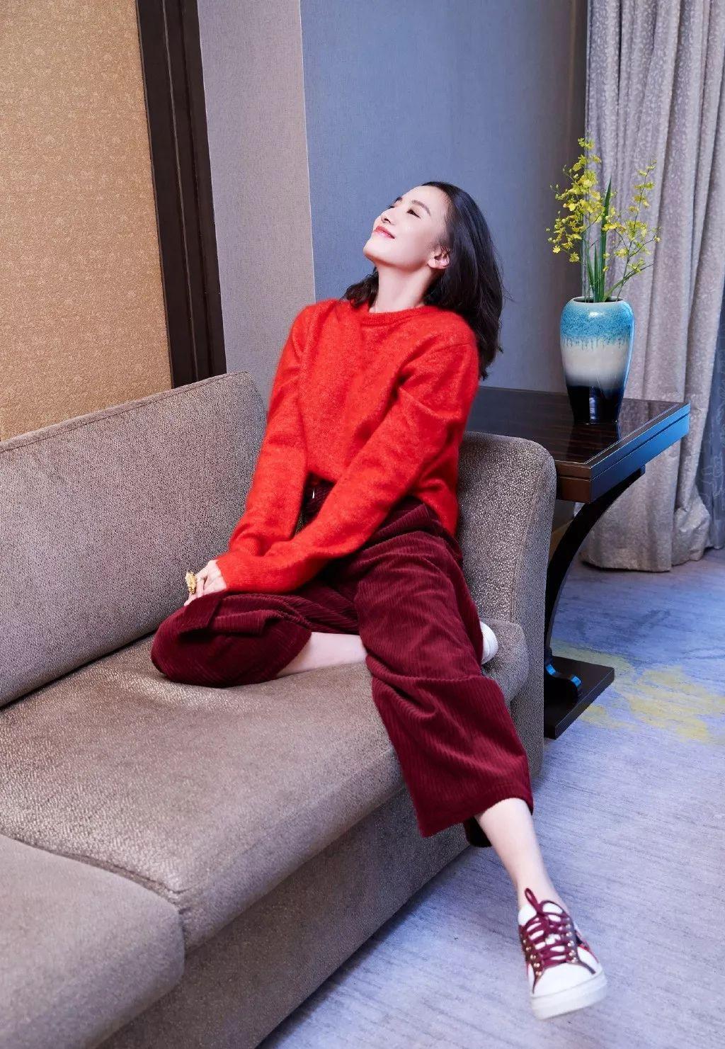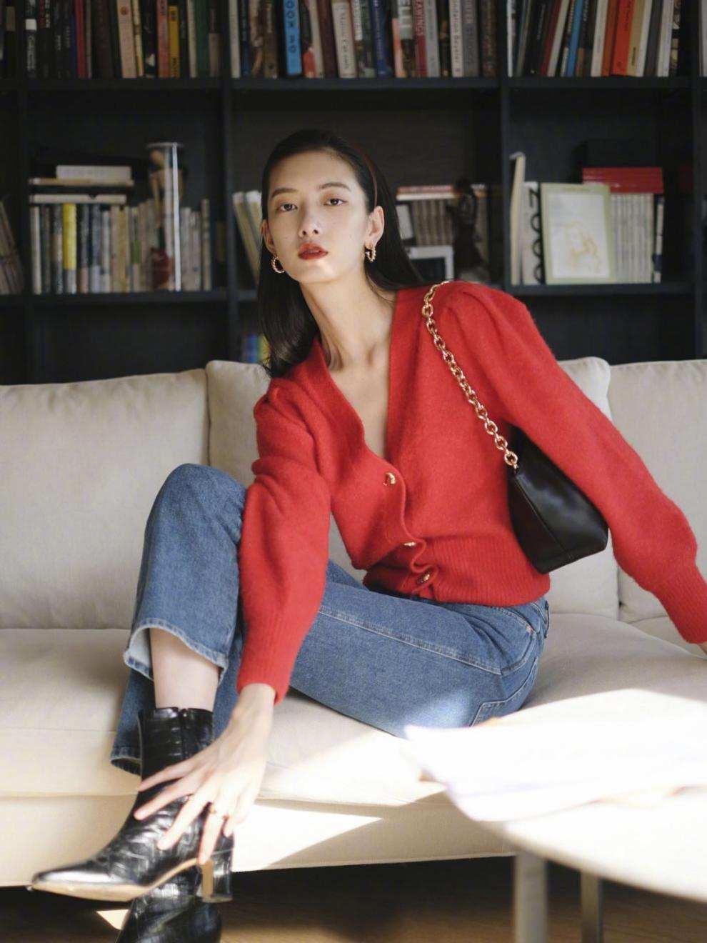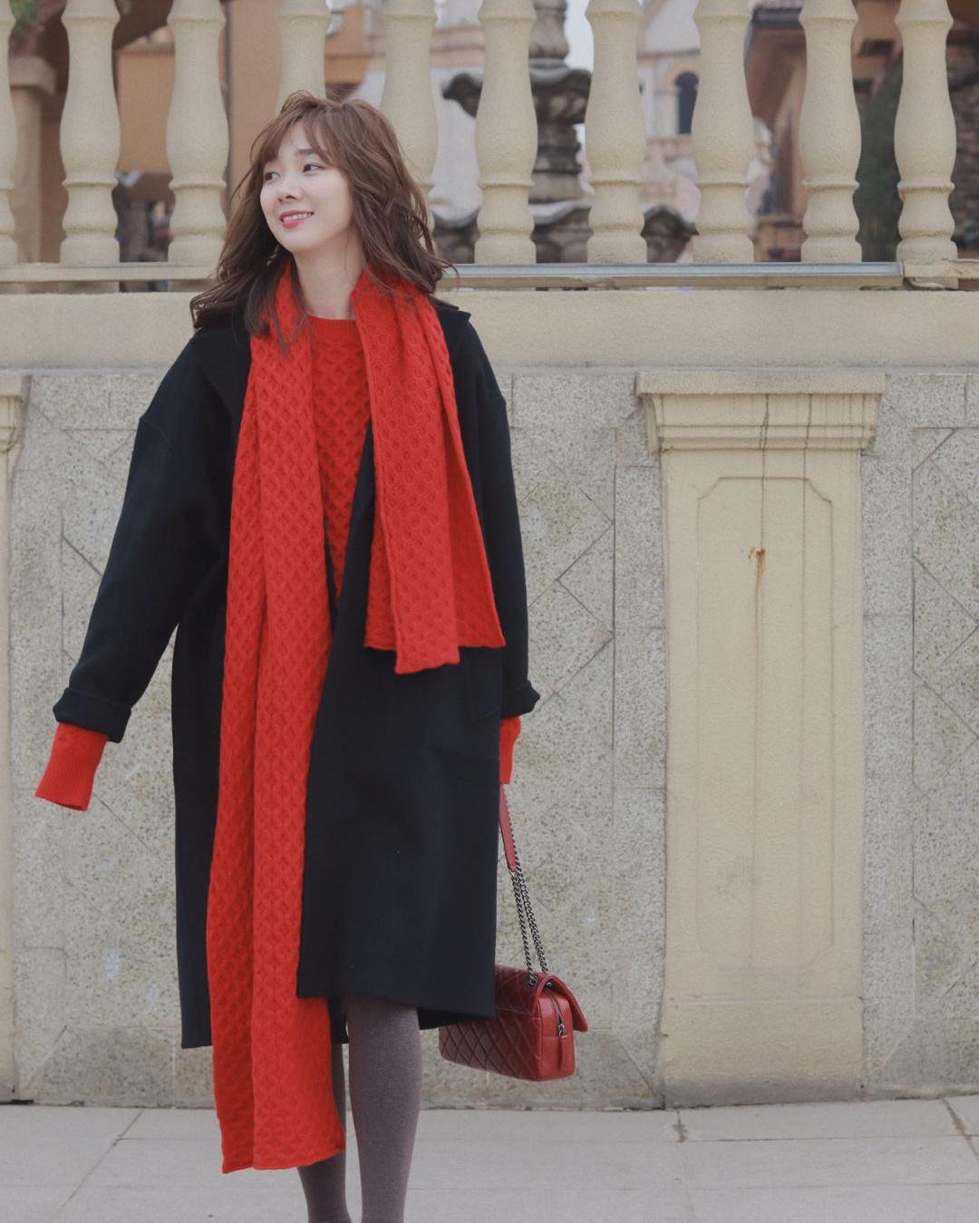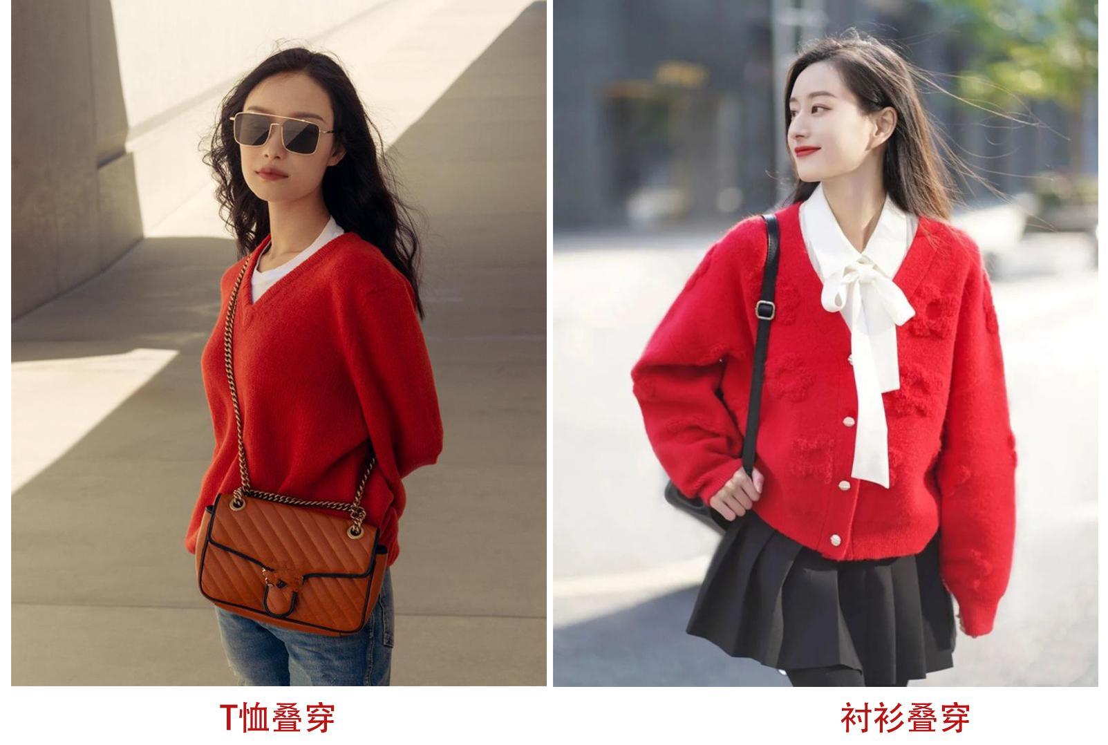 红色毛衣扮演内搭的角色,其实就是在给内搭创造足够的留白空间。让一些心有芥蒂的人也能大方接受红色毛衣的鲜艳和喜庆。