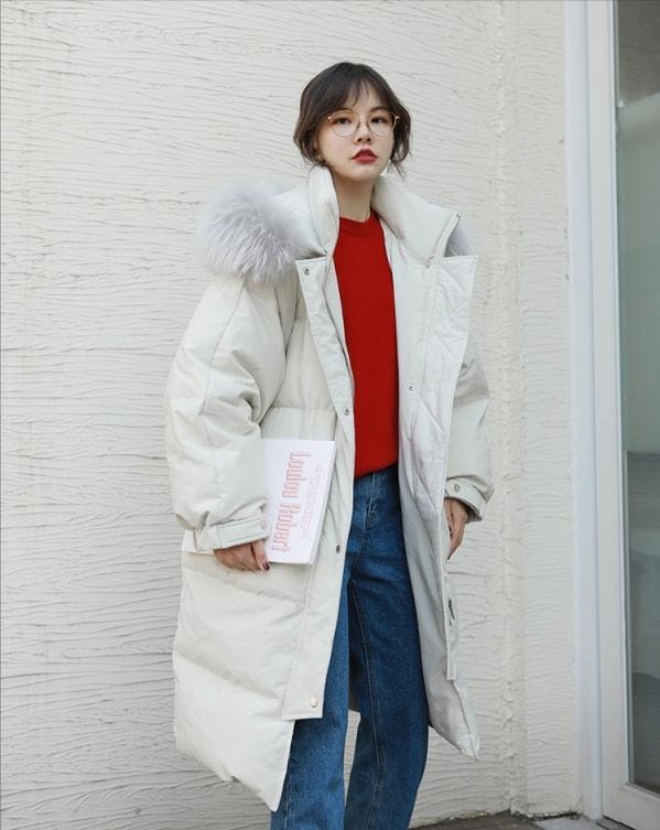 但弊端也有,过年这几天温度可能会暖和些,但大面积的露蛮腰还是会很冷,那我们就要另辟捷径了。这第二种搭配思路便是采用塞衣法,通过把衣角塞到裤腰的方式,穿出上短+下长。