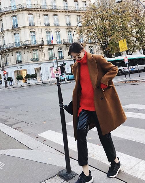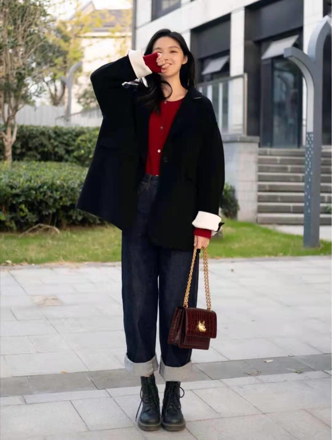 思路二,外套裁剪极简,红色本身已经属于高饱和的吸睛色彩,如若外套裁剪更复杂。加上红色毛衣,势必会造成穿搭没重点,甚至直接造成上半身膨胀感的臃肿,这对我们也是不利,因此外套也需要选剪裁极简的款型。