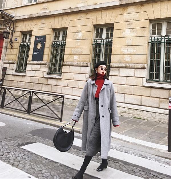万能的经典灰也一样,灰色色系是偏暗的,但是和明亮红色内搭的组合,整体又有了焕然一新的既视感。