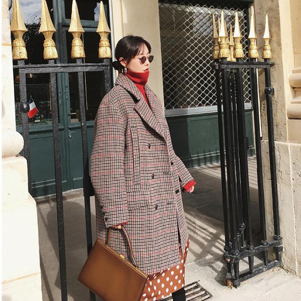 格纹大衣,很多时候总让人觉得老气横秋,而格纹从色彩角度,它也属于暗色系,搭配上明亮的红色内搭,视觉上有了提亮效果,整体搭配便有了质感和新鲜感。