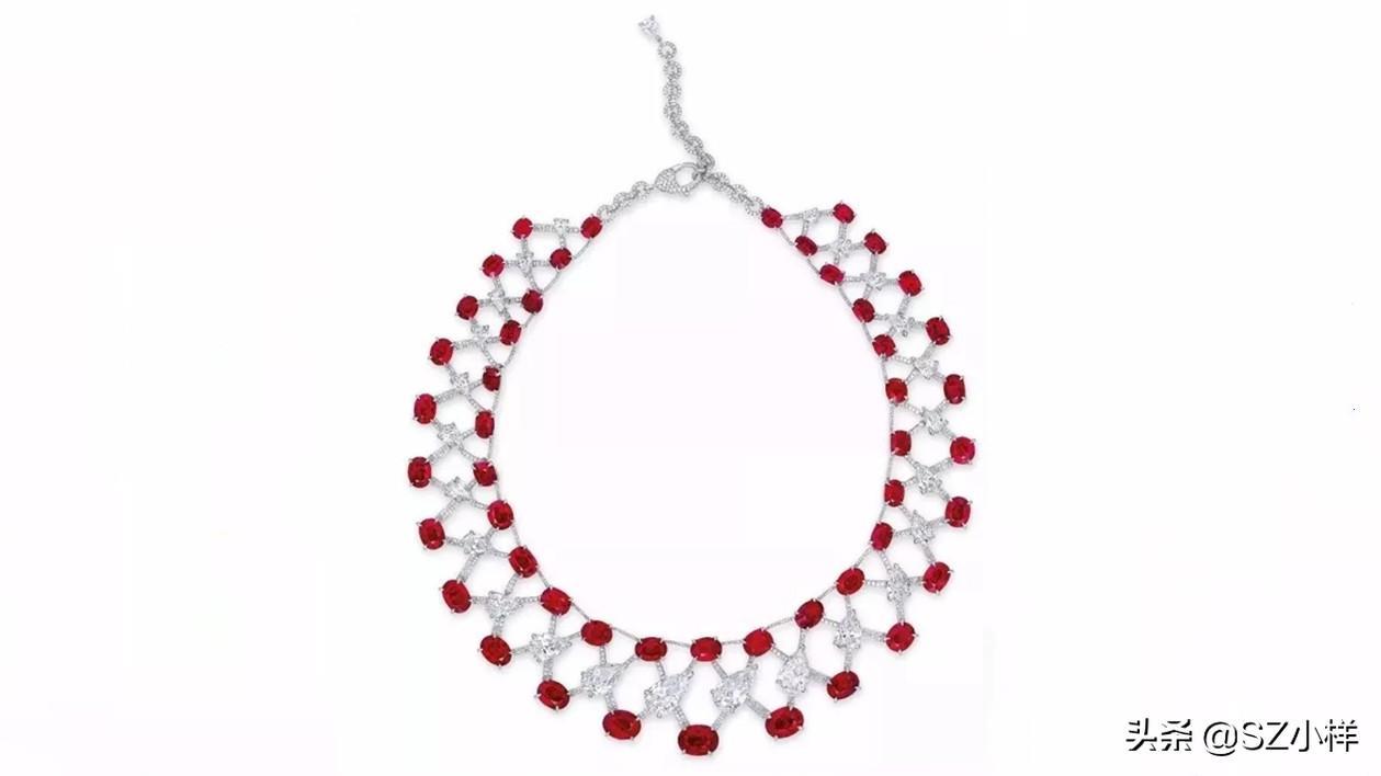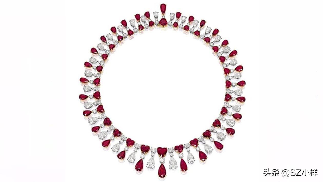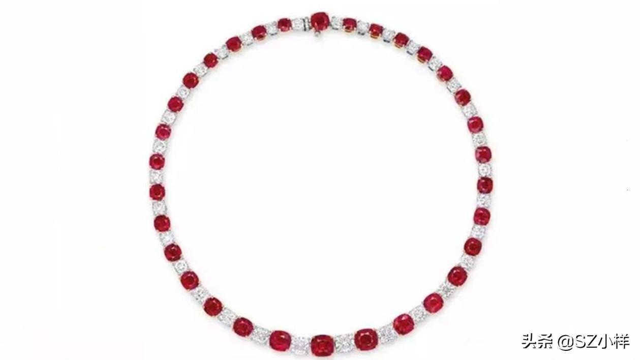 这条红宝石配钻石项链,镶嵌32颗枕形切割红宝石,每颗红宝石重1.04克拉—5.05克拉,所有的红宝石均产自缅甸,未经加热优化处理,并间隔镶嵌钻石。2015年12月,佳士得香港拍卖,成交价55,560,000港币(折算717万美元,或4625.82万人民币)。