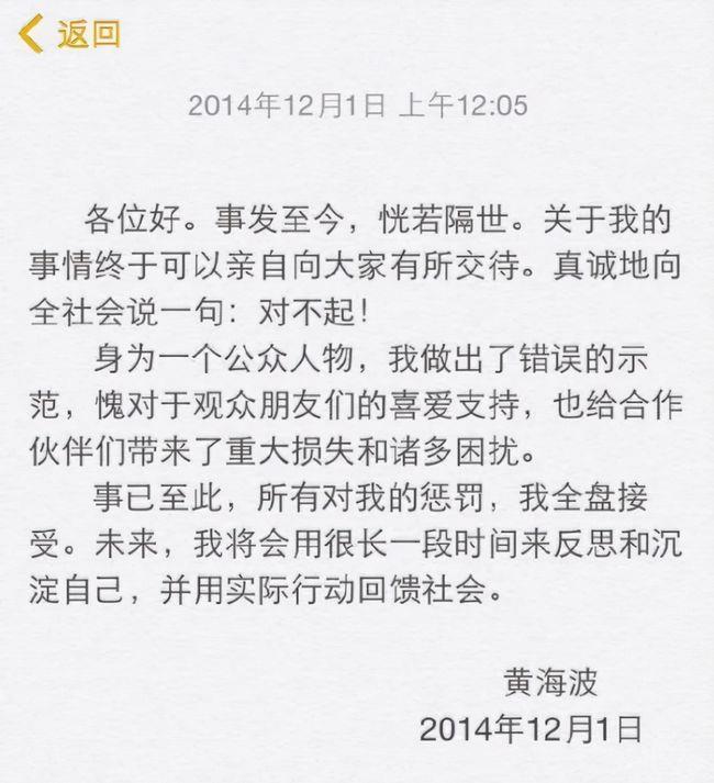 随后其所属经纪公司在17日也公开向公众致歉,为黄海波的非法行为给大家造成不良影响道歉。