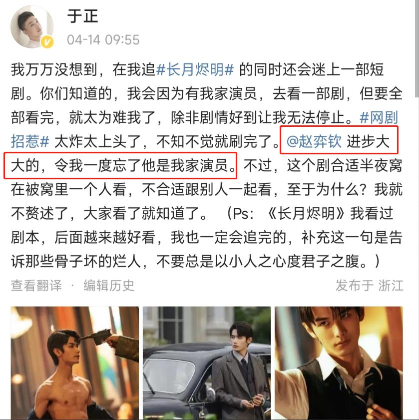 事情的起因是最近赵弈钦主演的网剧《招惹》刚刚完结,这个时候导演于正就在微博,为自家旗下的男演员赵弈钦声援。