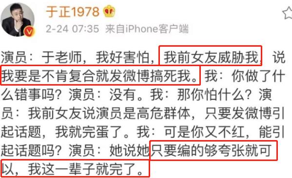 2019年2月24日,这天于正在微博发布了自己和旗下男演员的对话,对话中可以看到,于正收到了自家旗下男演员的求救。