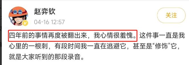 4月16日,赵弈钦发文为四年前的事道歉,这不就相当于变相地承认了所有的事实吗?这将为自己辩白的老板于正往哪里放?