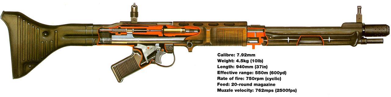 FG42全枪长0.94米,枪重4.2kg,枪口初速达到了740米每秒。射速在600米每秒和900米每秒之间,有效射程则达到了600米。