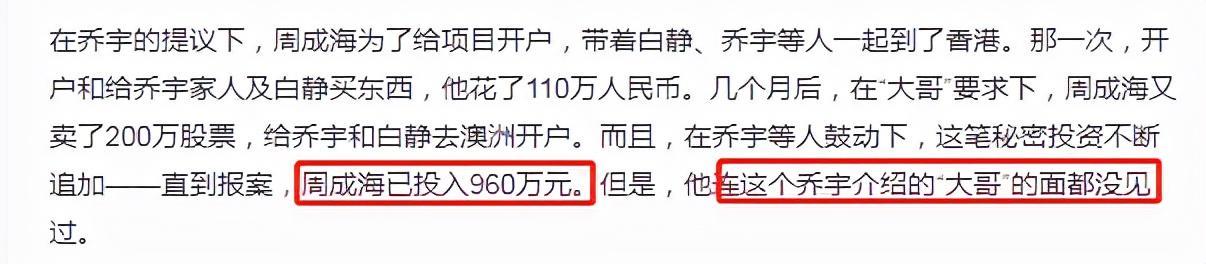 而乔宇谎称自己背地里有关系,帮助周成海解决了被人恐吓的麻烦,周成海就对他产生了信任。事实上,他不知道这一切都是乔宇自导自演的骗局,周成海还在事后支付了五十万的好处费,并将其推荐给妻子白静,正是这个做法让乔宇有了可乘之机。