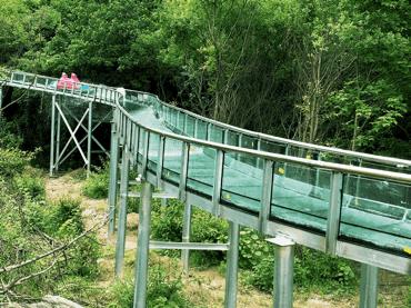以前的滑道只有一段是玻璃的,后面一段是在水渠里面滑行,而现在的滑道则是全玻璃架高在空中,全长2000米左右,上下落差最高可达150余米,滑道有多处弯道,根据地形在林间穿梭,滑完全程需要大概5分钟。