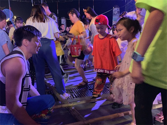 然后还有竹竿舞,土家族的姑娘小伙儿们会扛着长长的竹竿来到舞台下方,邀请游客加入他们一起跳舞。