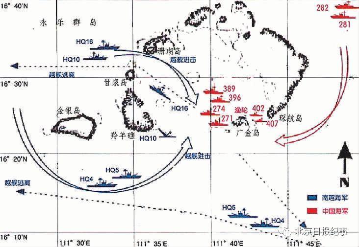 西沙海战示意图。HQ4、HQ5、HQ10、HQ16分别为南越海军陈庆瑜、陈平重、怒涛、李常杰号。