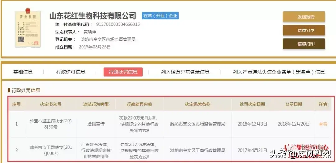 涉嫌虚假广告和涉嫌传销行为总是同时存在的,山东花红的相关产品也不例外。两次因广告夸大宣传遭到当地市场监督部门的查处,分别罚款22万元和2.3万元。