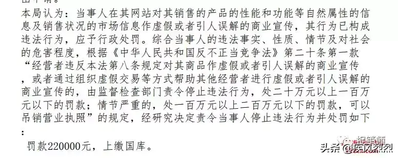 2018年12月3日的处罚决定书中称:“违反 了《中华人民共和国反不正当竞争法》第八条第一款“经营者不得对其商 品的性能、功能、质量、销售状况、用户评价、曾获荣誉等作虚假或者引 人误解的商业宣传,欺骗、误导消费者”之规定,构成作虚假或者引人误 解的商业宣传的不正当竞争行为。”