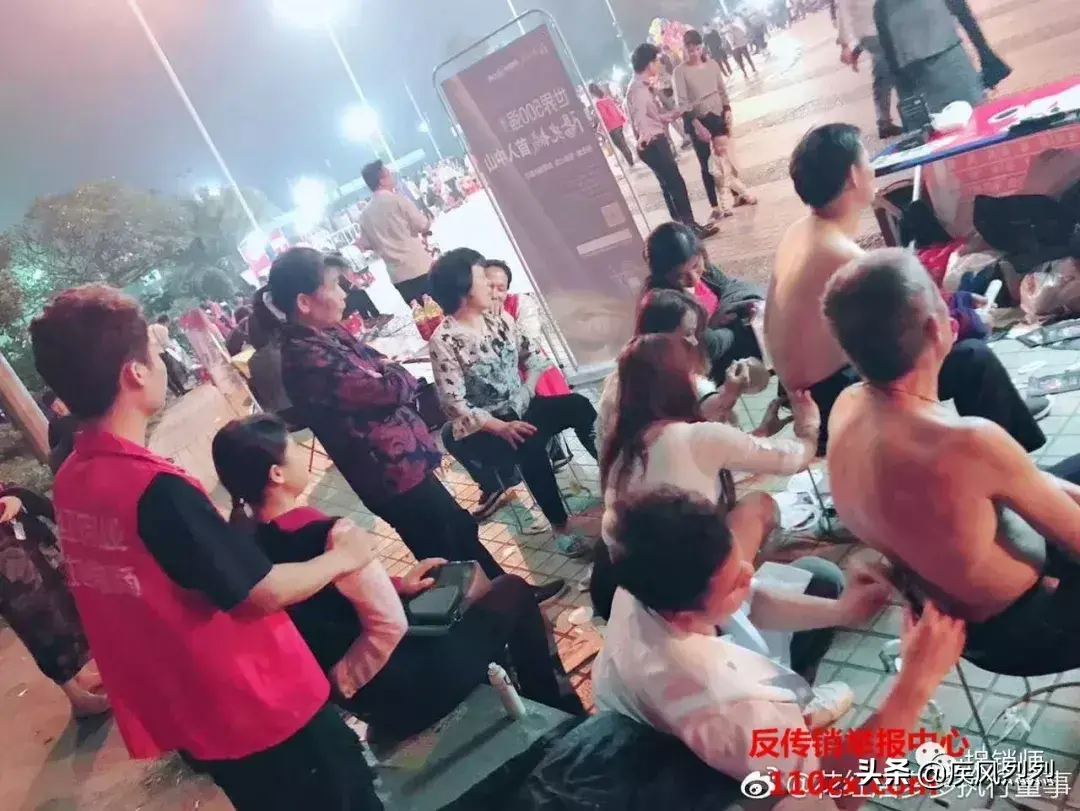 注意地推人员的红马甲、推销地点以及赤裸上身的使用者