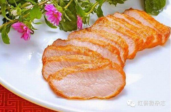 将里脊肉腌好后入预热的烤箱用200度烤制30分钟,边烤边刷蜂蜜和大红浙醋各10克即可取出切片装盘。