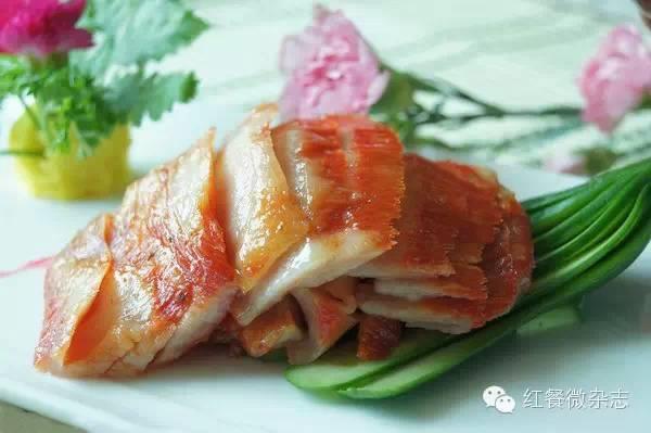2、用铁扦穿起来,整块挂入烤鸭炉内烤至七成熟,取出,用竹签在肉皮表面扎眼(猪皮密度较大,扎孔可使猪油从孔中冒出来),继续上炉用230℃烤制15分钟至表皮焦黄,取出,改刀成块,装盘即可。