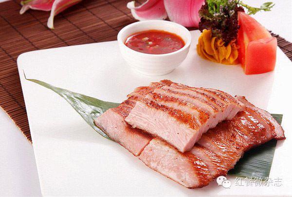 这个菜加上苹果醋及蕃茄酱腌制,可解猪颈肉的腻。吃时配上泰式酱汁(芫荽、大葱、红椒、大蒜各10克榨成蓉,加柠檬汁、苹果醋各20克,盐、蜂蜜各3克调和均匀),令口感更加丰富。