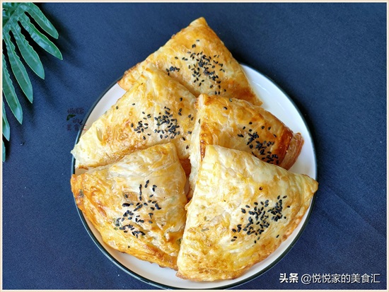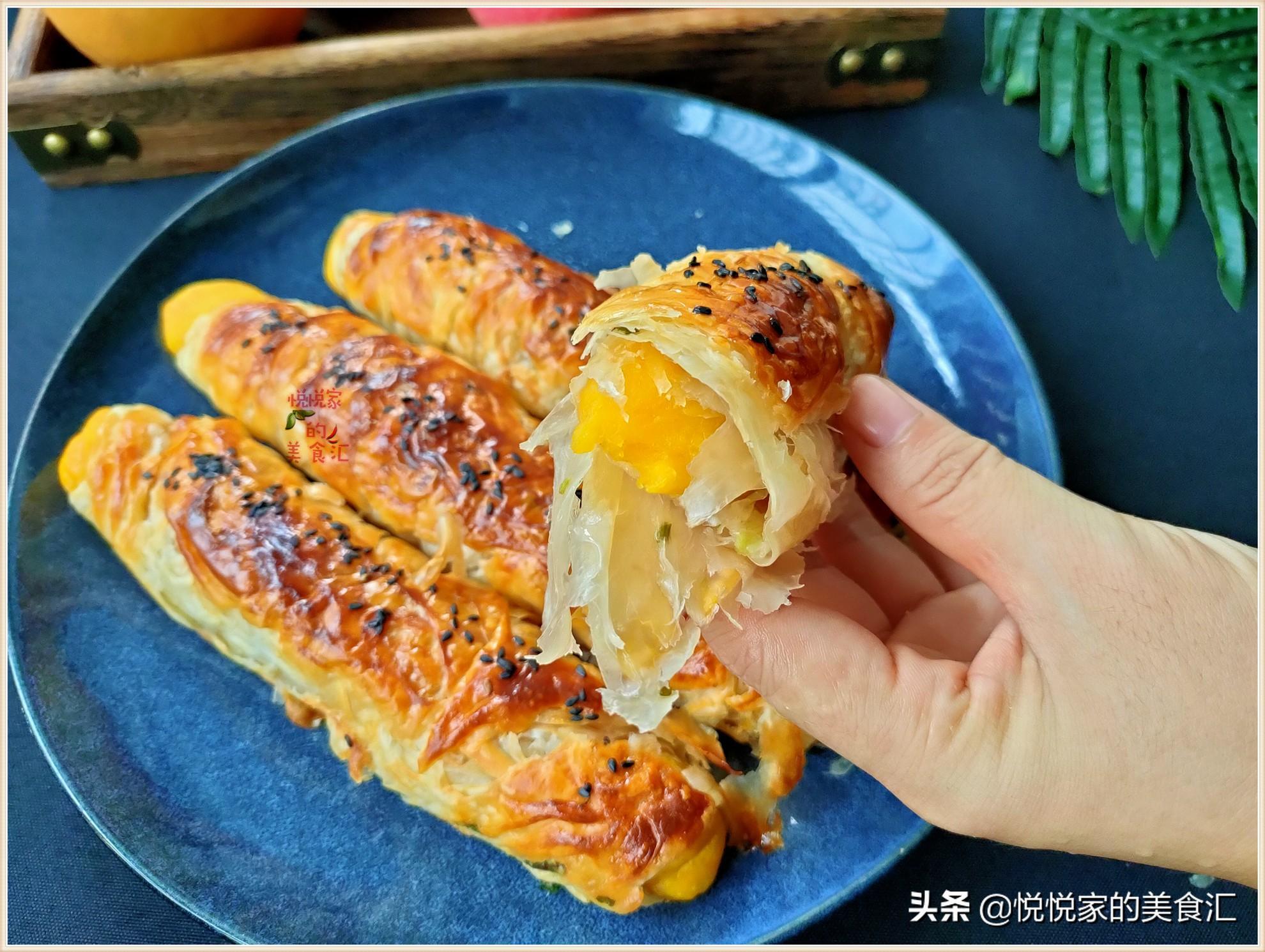 4.烤熟取出后发现手抓饼已经被烤得层层酥脆,层次分明,用手轻轻一碰就酥得掉渣了,放入嘴里后葱香浓郁,酥脆可口,里面的南瓜馅料香甜软糯,用手一扯的话糯性十足,甜甜的馅料再加上酥脆的表皮形成了鲜明的对比。