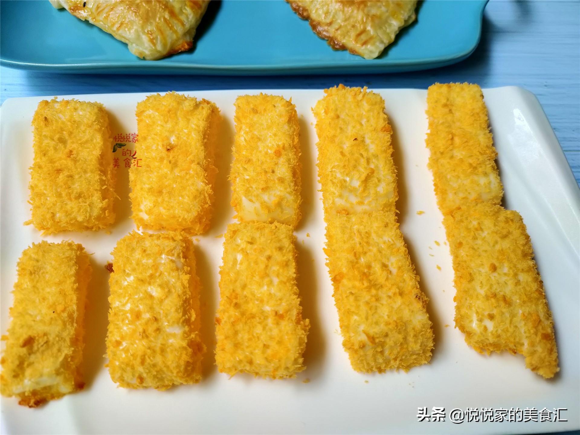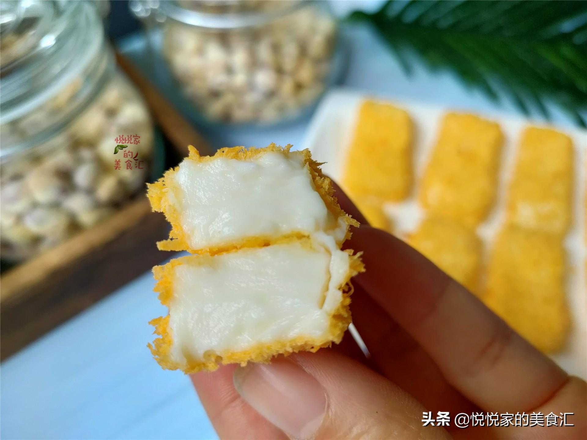 4.冷藏这一步的目的呢,主要是为了让牛奶块凝固的更好,其实只要奶糊煮到位,常温冷却也是一样的,然后取出来放在案板上面在切成小块状,裹上面包糠放进烤箱烤10分钟即可。