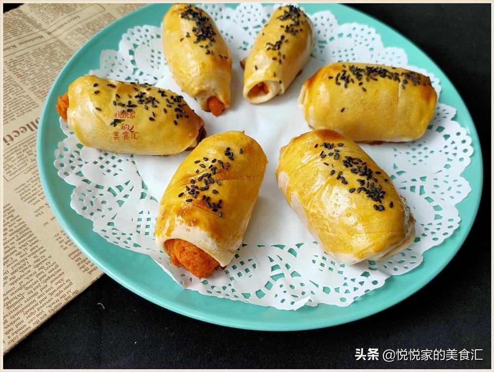 3.然后从底部卷起来放在一边备用,重复这个动作把所有的饼皮全部做完,取烤盘刷食用油防粘,把饼皮放入盘中,取一个蛋黄搅散成蛋液,用刷子把蛋黄液抹在生坯上面,抹上蛋黄液能够让这种小吃烤出来颜色更好看,然后在表面撒上一点黑芝麻作点缀,然后放入烤箱,上火150度,下火70度烤十分钟。