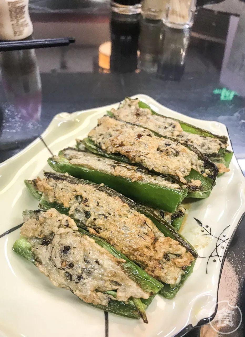 青椒酿肉和平时吃得不太一样,用的是鱼肉,口感弹牙多汁,青椒皮煎得微焦,组合在一起也是别有风味,鲜香的味道爽到全身毛孔都张开~
