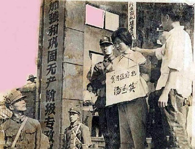 汤兰英双手反绑,胸前挂着一个大牌子,上面写着几个醒目的大字:贪污盗窃犯汤兰英。