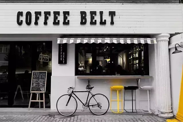 门口柠黄色的小灯光涂鸦墙,黄、白、黑三种颜色的高脚椅,店门前的梧桐树,以及白色基调的黑色店名,都透露着一股浓浓的清新的欧美简约风。店内白色墙上的世界地图,线条黑白分明,处于南、北回归线之间的“COFFEE BELT”横跨整个地球,这也是店名的由来了。