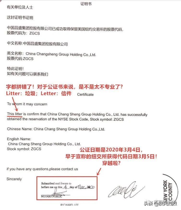 其次,其并非以“纽交所官方文件”来提供佐证,而是以一纸中英文对照的“公证书”来证明: