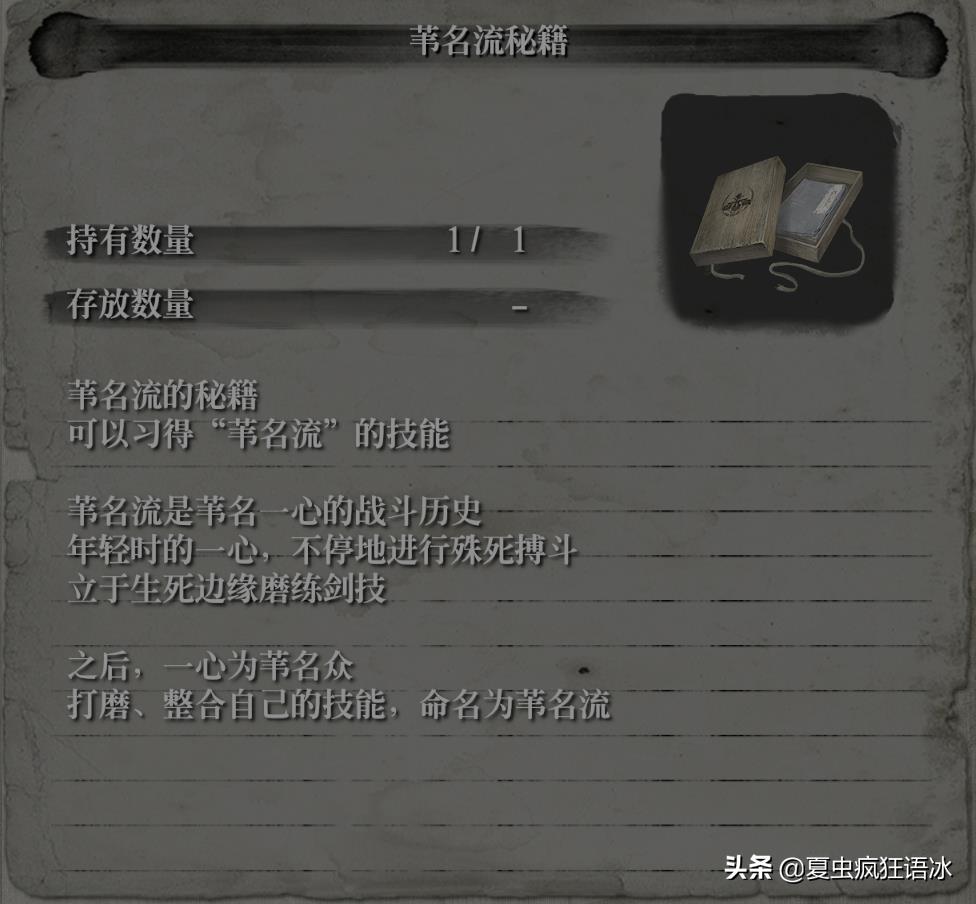 以前的文章里,我详细分析过“苇名流”,这是一本将一心一生的武学剔除支脉,留下最精髓最易学的部分的武功秘籍。