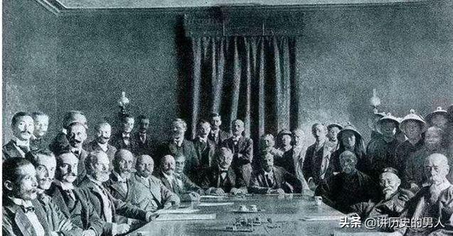 (下图为联军侵略者和大清朝代表在签署辛丑条约)