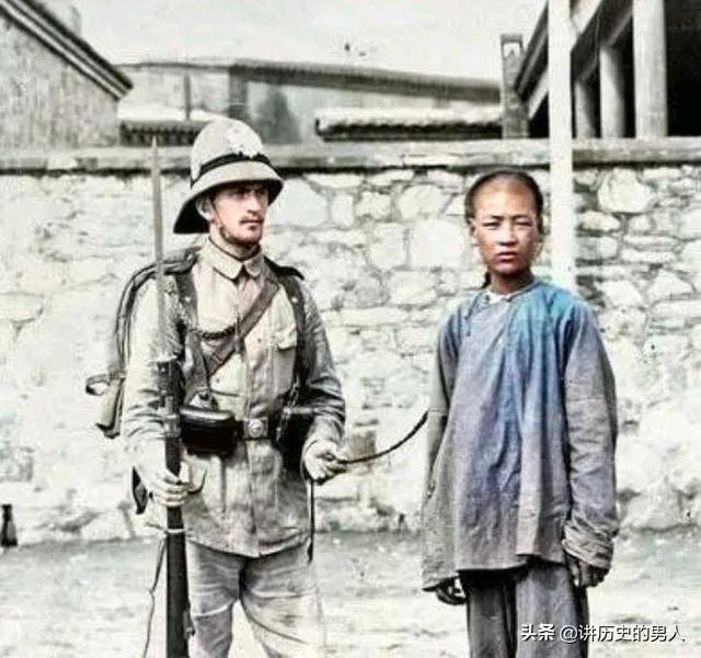 上图为英国侵略者抓着一位义和团成员,不难看出,这位义和团成员表情迷茫,面带青涩,应该才15岁左右。