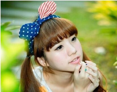 简单的双马尾发型,齐齐的刘海微微内扣,修饰着妹纸精致甜美的瓜子脸,随意扎成的两条马尾辫灵活灵现,美眉棕色的发色非常的衬肤色,再在头顶点缀上可爱的蝴蝶结发箍,使小美眉的甜美感瞬间爆棚。