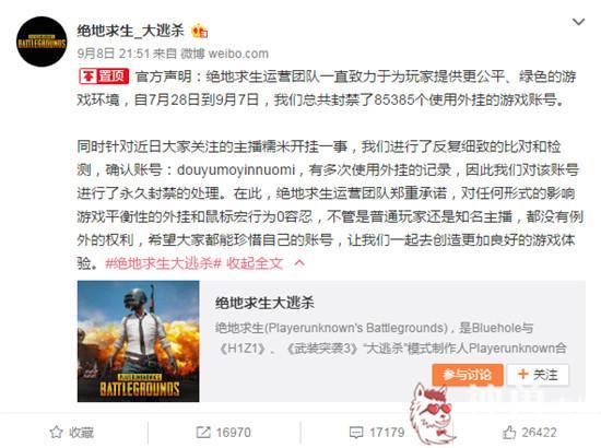 而斗鱼一方则在绝地求生官博发表声明后也第一时间发出了处理公告,不仅永封了糯米的直播间,还将追究并返还糯米直播时收到的所有打赏。而毒奶色黄旭东则至今没有任何回应。不得不说,此次多方大佬在处理此事上都非常果决,而糯米作为一个小人物确实没有太多发声的机会。现如今他仍在用自己的方式想证明自己,让网友不禁怀疑:如果他真的一直在用挂,有必要这么刚吗?