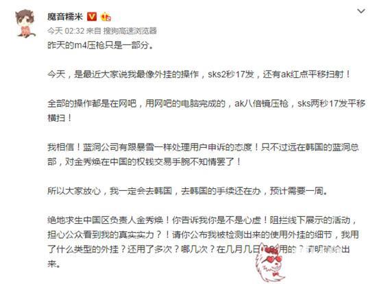 对此糯米第一时间在微博发声表示:绝地求生大逃杀中国区负责人金秀焕成功阻止了约战,迫于无奈他只能以录像的形式来展示自己的实力。随后他在两天时间内上传了M4压枪和SKS平移横扫的视频,同时还发布了线下实况93分钟的视频,全程无任何剪切,在普通网吧用20块的鼠标操作进行还露脸了!包括AK横扫、八倍爆头、SKS两秒17发在内的操作视频中都有了。
