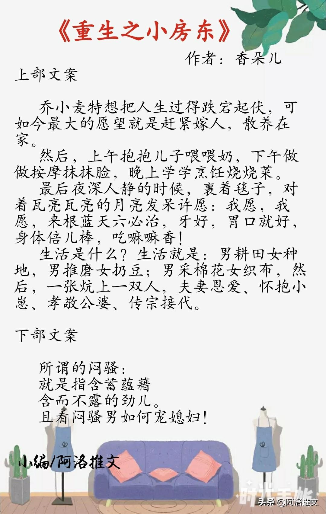 1、《重生之小房东》作者:香朵儿