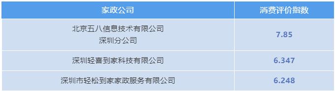 本次公布的深圳市消委会家政行业消费评价指数排行榜中,深圳市乐邦家政服务有限公司(3.15)、北京家事无忧家政服务有限公司深圳宝安分公司(2.68)、北京家事无忧家政服务有限公司深圳南油分公司(1.8)、深圳小白家政网络科技有限公司(1.2)等4家经营者未建立投诉处理便捷通道,投诉处理效率较低,增加了消费者维权成本,消费者应谨慎选择。