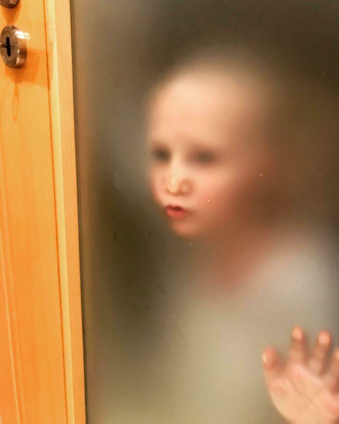 我们浴室门是半透明的,小家伙的跟踪,把这件事提升到一个诡异的水平。