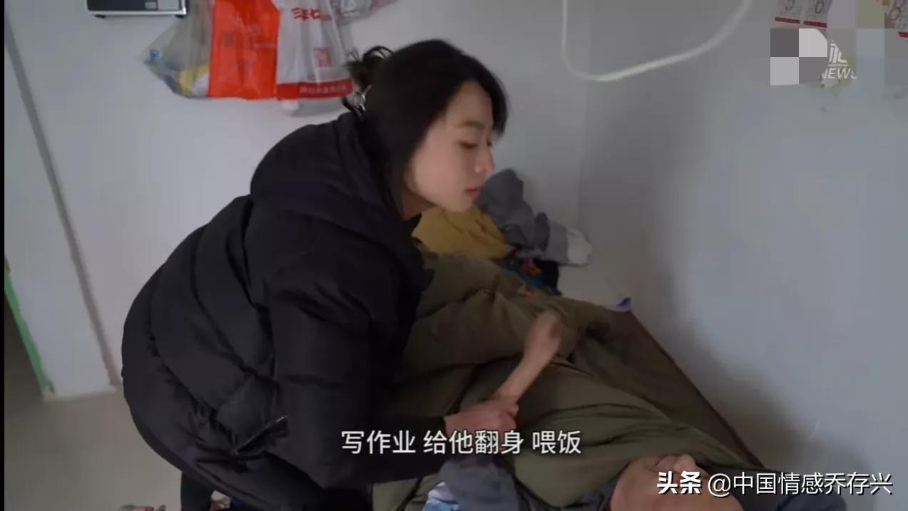 她在家里一边写作业,一边还要照顾爸爸翻身,喂饭。