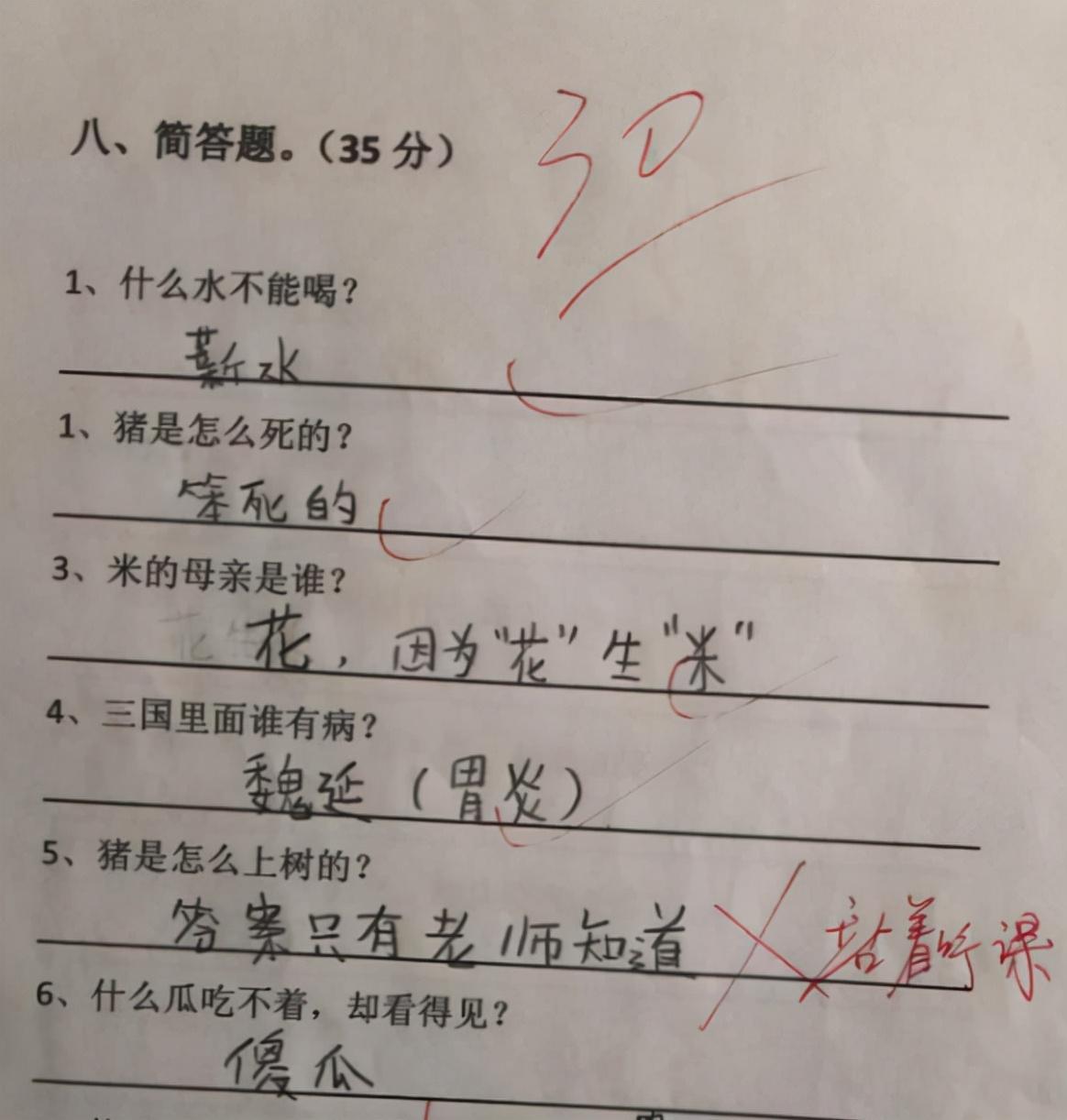 “猪是怎么上树的?”,老师批语“站着上课”