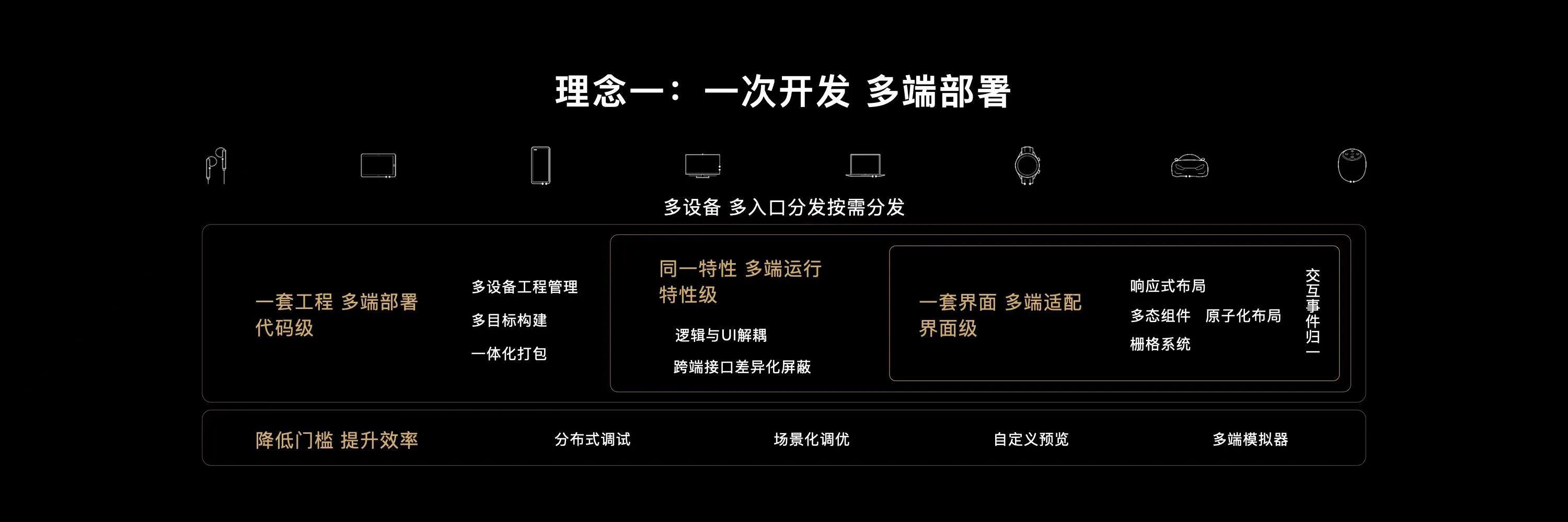 2022年鸿蒙自研代码量达2000万,同时华为还提出了鸿蒙生态应用开发三大理念:一次开发,多端部署;可分可合,自由流转;统一生态,原生智能。
